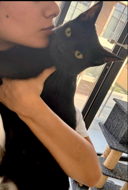 This charming boy is a sleek black short-haired cat with a cute white patch on his belly that makes him look like he’s wearing a little tuxedo.
