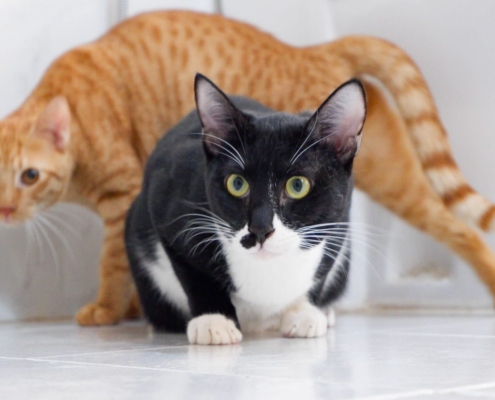They are still young and energetic, so they’ll need plenty of space to run and play. They are an indoor cats only or can have an access into a fully catproofed balcony and garden.