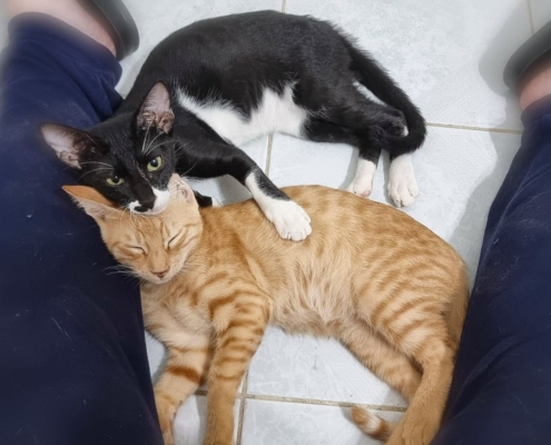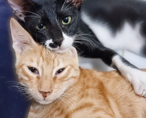 Bumble and Bee were rescued as kittens when they were found all alone on the street without their mother. Brave Bee was the first to approach his rescuer, followed by his two siblings. Despite their young age, they are already incredibly sweet and affectionate, enjoying cuddles and snuggles.