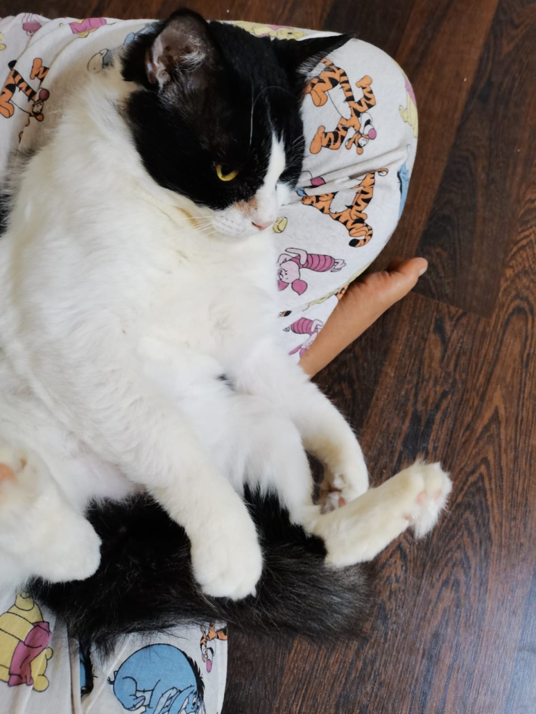 One day, Zorro was found weak and unwell and was rushed to the vet. Testing revealed he is FIV positive, which meant outdoor life was no longer safe for him. FIV simply means a weakened immune system. It is cat-specific, cannot be transmitted to humans, and is only passed between cats through deep bite wounds. With good nutrition, regular vet care, and a safe indoor life, FIV-positive cats like Zorro live long, happy, perfectly normal lives.